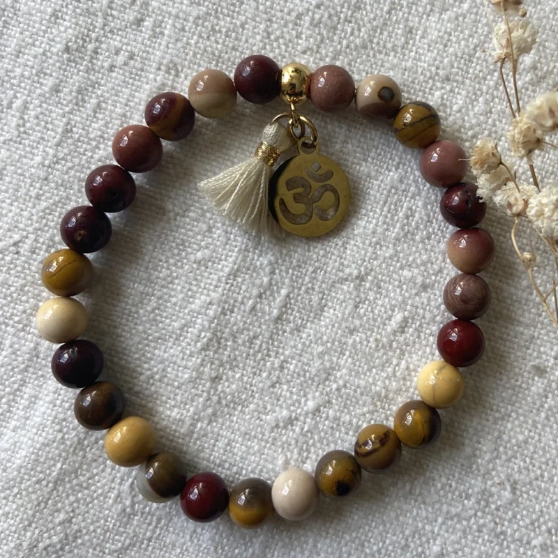 Uma seleção de pulseiras e colares em pedras naturais e aço inoxidável, prateados ou dourados.